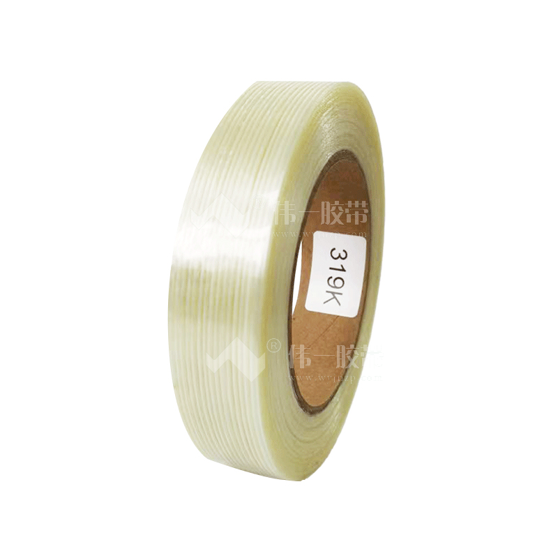 纖維膠帶由高強度玻璃纖維紗或布為強化背材復合聚酯(PET film)薄膜,涂布強粘性熱熔壓敏膠粘劑而成。玻璃纖維膠帶強度比普通膠帶高很多,同時粘性也得到了極大加強,耐磨性能及抗潮能力等也表現(xiàn)的極為突出。